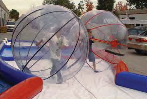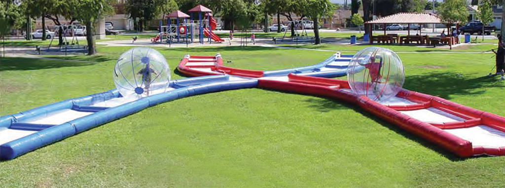 Il percorso è lungo circa 30 metri e largo 10 metri. Il direttore di gara deve prendere posizione nel punto d'intersezione delle due piste. Questo gli dà modo di aver chiara visione della gare. Gli sfidanti devono lanciarsi in una corsa mozzafiato e stare attenti a non perdere aderenza, dal momento che lungo il percorso ci sono degli ostacoli che fanno rimbalzare le sfere giganti. Questi ostacoli, con l'aggiunta della scivolosità dovuta all'acqua planning sono pericolosi man mano che ci si avvicina al punto d'intersezione, perché lì ci passa un solo concorrente.