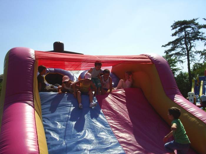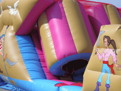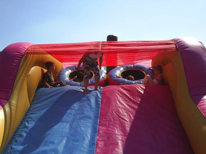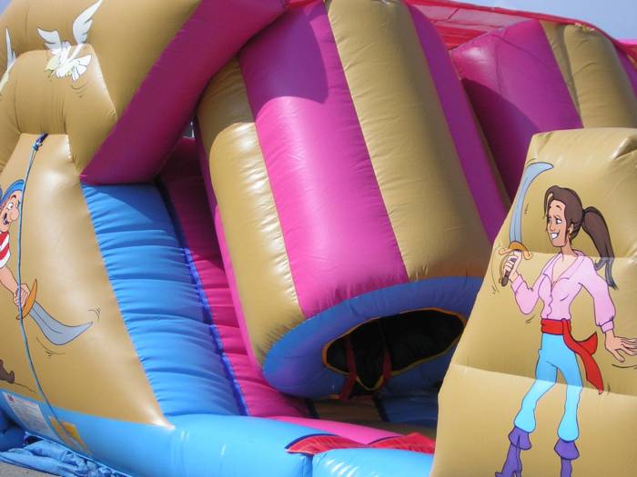 Con dei cannoni gonfiabili grandi, i bambini ed i ragazzi entrano e scivolano dopo aver saltato in un tappeto gonfiabile composto da birilli e passaggi stretti.
