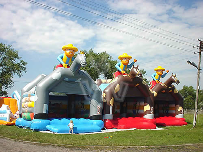 Il gioco gonfiabile salta salta adatto ai compleanni per i bambini a cui piacciono i cow boy. Un salta salta di 5 metri per 5 metri di base alto 5 metri. Una struttura gonfiabile dove i bambini saltano in tutta sicurezza. Noleggiare un gioco dove su 25 metri quadrati si salta in alto. Chiuso da tre lati e coperto nel tetto. Davanti si presenta con un cavallo gonfiabile.