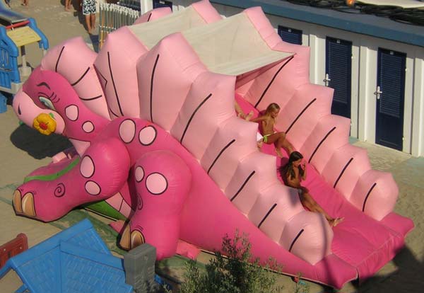Di dimensioni leggermente inferiori al Dragon Slide, questo scivolo gonfiabile molto simpatico ne ripropone la tipologia più al femminile, e può essere combinato con un gioco salta salta.