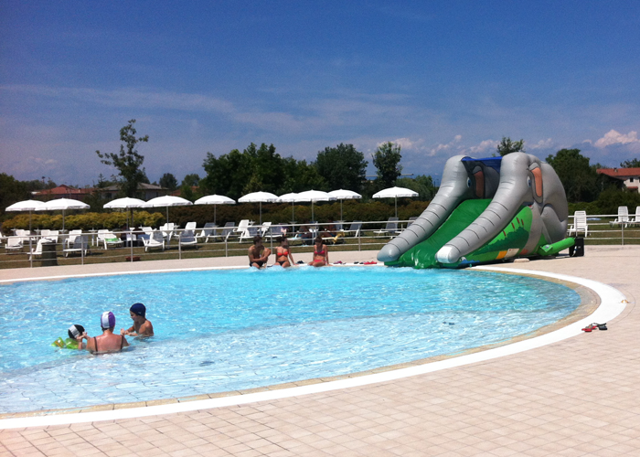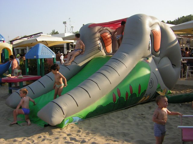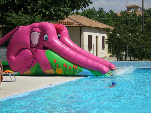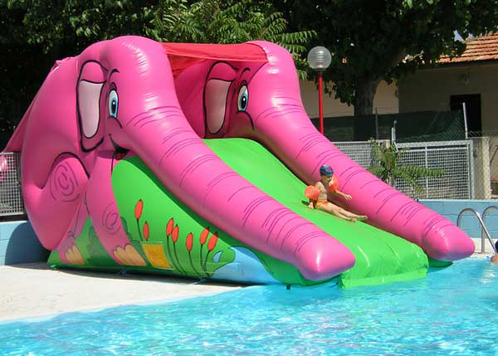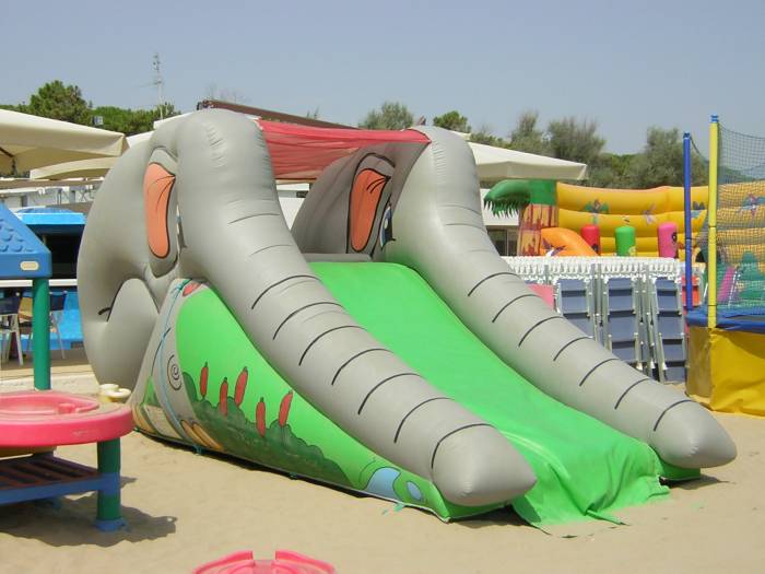 Decisamente fra gli scivoli gonfiabili più simpatici, questo scivolo elefante di medie dimensioni ma con scivolata relativamente lunga si adatta a situazioni estive specialmente in abbinamento a sabbia, e/o acqua del mare o della piscina.