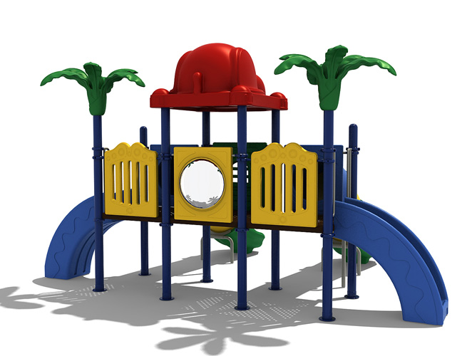 Castello in alluminio e polietilene a forma di veliero, un vero e proprio parco giochi, che comprende uno scivolo singolo ondulato, una vela e una scalinata.