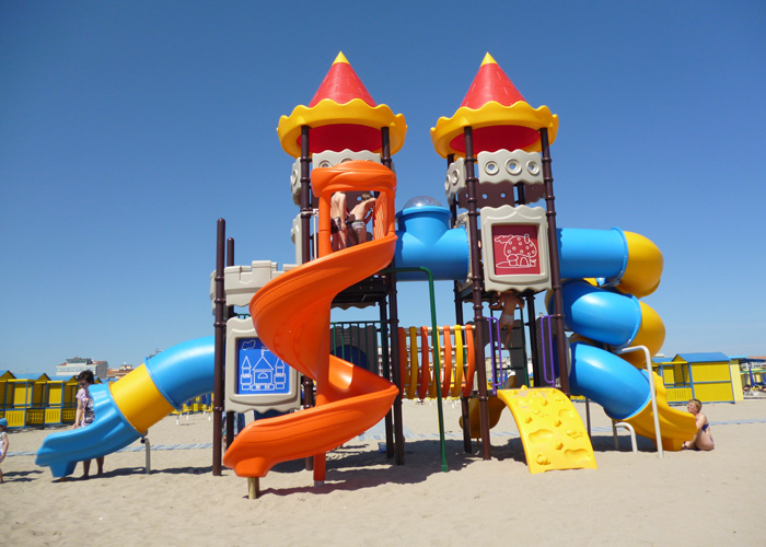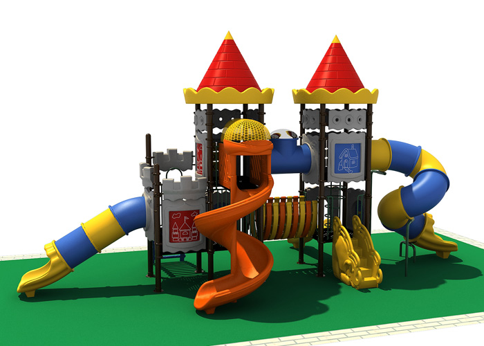 Gigante fantacastello a due piani con due torri altissime e di grande impatto scenografico. Un vero e proprio parco giochi, completo a tema fortezza con bellissimi colori, elementi decorativi, scivoli bicolore (blu e giallo), scalette per salire, tunnel ed altre fantastiche attività di ogni tipo.