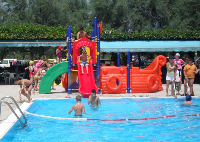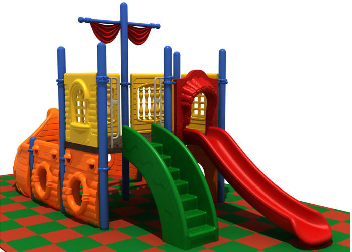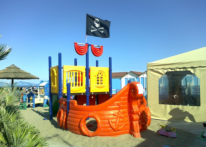 Castello in alluminio e polietilene a forma di veliero, un vero e proprio parco giochi, che comprende: uno scivolo singolo ondulato, una vela e una scalinata.